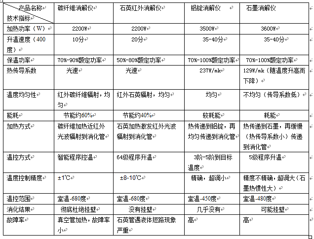 凱氏定氮儀原理,在做定氮前,我們先要做樣品的消解前處理。那么先從消解儀說起,消解儀還有一個別名叫消化爐。消解儀適用于食品、醫藥、農業、林業、生化等行業以及高等院校、科研部門對種子、土壤、植株、飼料、食品、礦石等化學分析之前的樣品消解處理。目前市面上的消解儀分為石墨消解儀,鋁錠消解儀,遠紅外消解儀,碳纖維消解儀。這么多不同叫法的消解儀,到底我們使用那種的好呢?我給大家做了一張對比表,根據自己的使用需求,選擇適合自己產品。