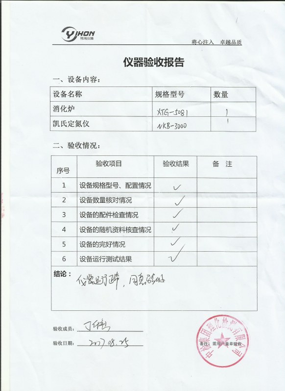 中檢集團(tuán)理化檢測有限公司采購上海祎鴻提供的凱氏定氮儀NKB3000,紅外消消化爐XTG5081設(shè)備,主要針對土壤等來料的蛋白質(zhì)含量檢測,已順利完成驗收工作。